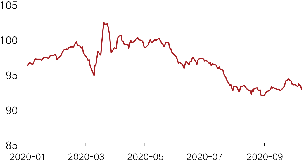 數據顯示,2020年前10月,人民幣債累計同比13.4%、美元債累計同比-24.4%,結合未來3個月到期人民幣債3315.0億人民幣(2019年11月-2020年1月在1693.6億人民幣)、美元債180.7億美元(2019年11月-2020年1月在107.5億美元),不考慮債務轉嫁,我們預計今年人民幣債累計發(fā)行同比在19.0%~32.6%、美元債累計同比在-22.6% ~ -15.0%。