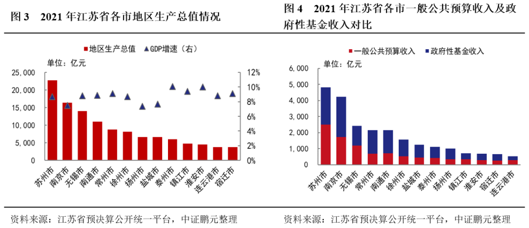 從全省情況來看,江蘇省經(jīng)濟財政實力依然位居全國前列。2021年,江蘇省實現(xiàn)GDP總量11.64萬億元,人均GDP13.70萬元,是全國人均GDP的169.23%;且近年產(chǎn)業(yè)結(jié)構(gòu)持續(xù)轉(zhuǎn)型升級,工業(yè)實力雄厚,上市公司數(shù)量居全國第三,經(jīng)濟發(fā)展活力較強。財政方面,2021年全省實現(xiàn)一般公共預算收入10,015.2億元,政府性基金收入13,632.95億元,分列全國第2和第1。雖然江蘇省廣義債務率處于全國較高水平,但其經(jīng)濟財政實力雄厚,且產(chǎn)業(yè)結(jié)構(gòu)合理,短期內(nèi)可對債務償還形成有力支撐。