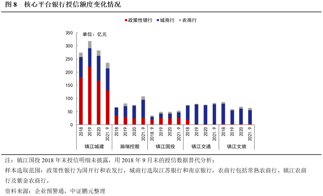 省內(nèi)城農(nóng)商行對五大核心平臺融資支持力度較大,授信規(guī)模增加明顯。由于鎮(zhèn)江尋求國開行進行隱性債務置換的方案未最終落地,政策性銀行對鎮(zhèn)江城投平臺的融資支持力度較弱且缺乏普遍性。2018年到2019年期間,僅鎮(zhèn)江城建一家平臺獲國開行大幅提額,且2020年起五大平臺在政策性銀行的授信額度遭遇整體壓降。而城農(nóng)商行貸款主要集中于江蘇省內(nèi),與地方政府關(guān)系密切,在化解隱債的過程中更有可能成為政府協(xié)調(diào)金融資源的主要渠道。江蘇省內(nèi)共有4家城商行和56家農(nóng)商行,截至2020年末,總資產(chǎn)規(guī)模合計72,465.30億元,其中江蘇銀行及南京銀行總資產(chǎn)規(guī)模均超萬億元,可協(xié)調(diào)的金融資源較為豐富。2018年-2021年9月期間,省內(nèi)城農(nóng)商行對五大平臺的授信額度整體增加了79.54億元,融資支持力度更大且更具有普遍性和持續(xù)性。
