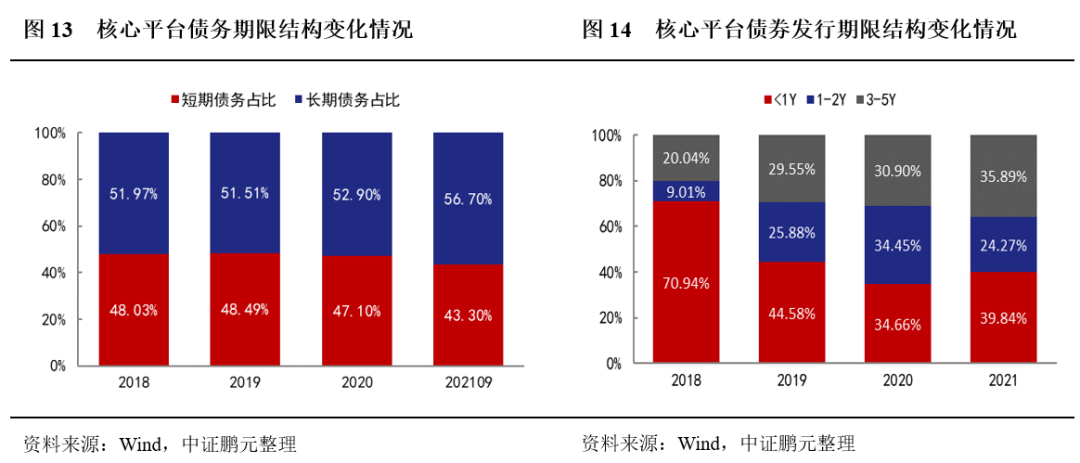 鎮(zhèn)江市核心平臺債券發(fā)行期限結(jié)構(gòu)近年整體改善明顯。從平臺債務期限結(jié)構(gòu)來看,2018年-2020年,鎮(zhèn)江五大市級平臺短期債務占比小幅波動,2021年1-9月,核心平臺短期債務占比顯著下降,債務期限結(jié)構(gòu)有所改善。從債券發(fā)行視角來看,核心平臺中長期債券發(fā)行比例呈現(xiàn)持續(xù)增長態(tài)勢,債券發(fā)行期限結(jié)構(gòu)改善明顯。