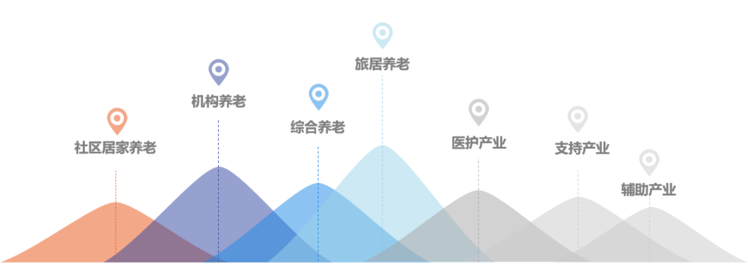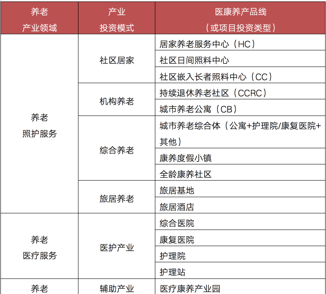 其中,涉及醫康養產業多達20余條,如居家養老服務中心(HC)、社區嵌入式長者中心(CC)、持續退休養老社區(CCRC)、城市養老公寓(CB)、城市養老綜合體、康養度假小鎮、全齡化康養社區、旅居基地/酒店、康復醫院、護理院、護理站等等;涵蓋養老核心產業、支持產業和輔助產業等全產業鏈條。