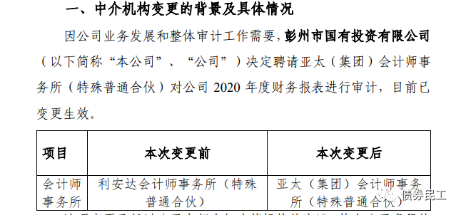 3、彭州市國有投資有限公司2021年4月30日公告,決定聘請亞太(集團(tuán))會計(jì)師事 務(wù)所(特殊普通合伙)對公司 2020 年度財(cái)務(wù)報(bào)表進(jìn)行審計(jì)。