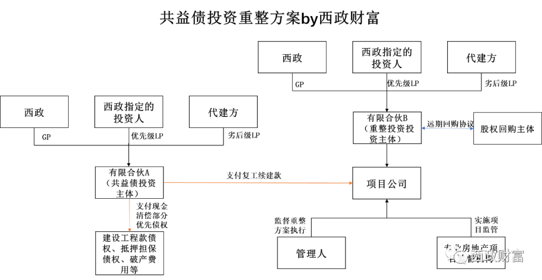 需注意的是,如果按常規(guī)操作繼續(xù)以債權(quán)的形式向項(xiàng)目公司注入資金,則我們這個(gè)繼續(xù)進(jìn)入的普通債權(quán)在法律層面無法得到充分的保障,因此就程序上的操作來說,在項(xiàng)目公司破產(chǎn)申請被受理后,我們的資金以共益?zhèn)鶛?quán)的方式完成進(jìn)入才能更好地確保我們自身的投資安全(參見下述融資架構(gòu))。