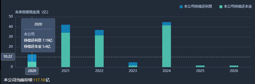 2020年,九華的償債壓力遠(yuǎn)低于往年。今年剩余待償還本金及利息總計約12.59億元,當(dāng)前存續(xù)債券本息共計117.1億,零散分布在未來7年內(nèi),其中2021年及2024年償債壓力最大,均逾40億元。