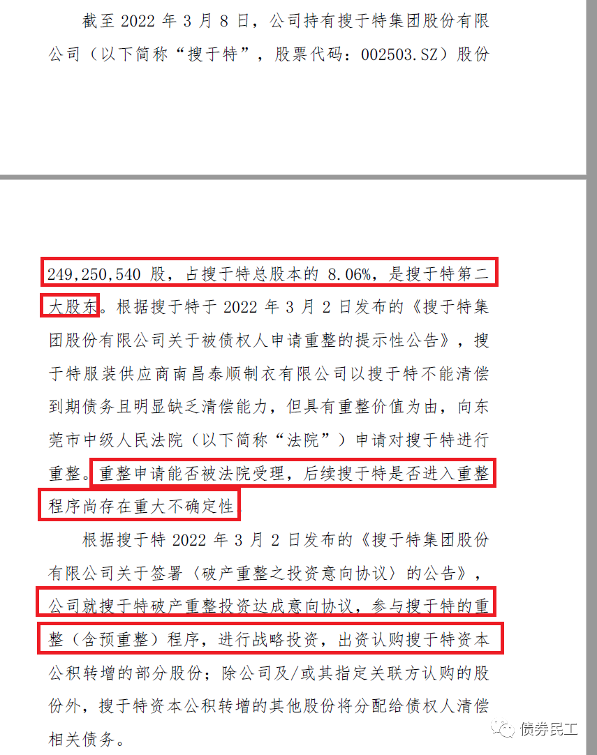 根據(jù)中證鵬元于2022年3月15日披露的關(guān)注公告,廣州高新區(qū)投資集團(tuán)有限公司(以下簡稱“廣州高新投”)就搜于特集團(tuán)股份有限公司(以下簡稱“搜于特”)破產(chǎn)重整投資達(dá)成意向協(xié)議,參與搜于特的重整程序,進(jìn)行戰(zhàn)略投資。也就是說,廣州高新投直接參與了上市公司的破產(chǎn)重整程序,這對于城投公司來說,并不是很多見。
