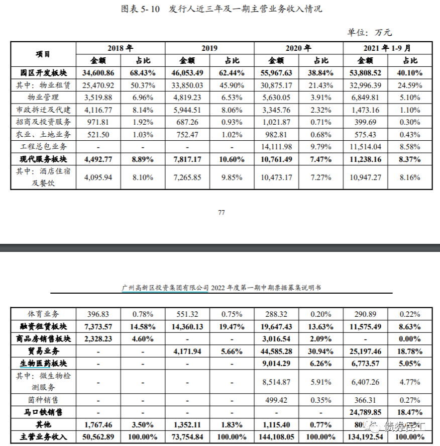 廣州高新投的實(shí)際控制人是廣州經(jīng)濟(jì)技術(shù)開發(fā)區(qū)管理委員會,主體信用等級為AA+(中誠信國際、中證鵬元、東方金誠和上海新世紀(jì))。廣州高新投的業(yè)務(wù)范圍包括園區(qū)開發(fā)板塊、現(xiàn)代服務(wù)業(yè)板塊、融資租賃板塊、商品房銷售板塊和貿(mào)易業(yè)務(wù)板塊等。其中園區(qū)開發(fā)板塊是廣州高新投最重要的主營業(yè)務(wù)。從業(yè)務(wù)范圍來看,廣州高新投屬于典型的城投公司。