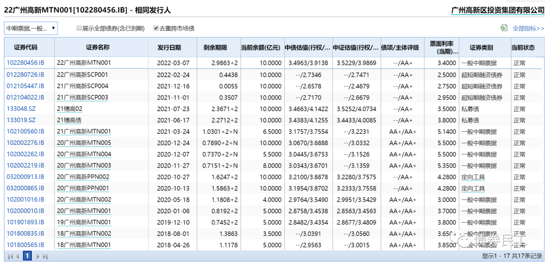 根據(jù)公開披露信息,廣州高新投目前存量債券17只,存量債券金額為132.50億元,債券產(chǎn)品包括中期票據(jù)、定向工具、超短融和私募債等類型,尚未發(fā)行過企業(yè)債券。