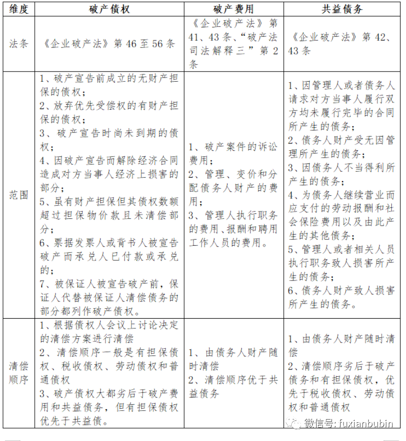在我國《企業(yè)破產(chǎn)法》2006年修訂時,將共益?zhèn)鶆?wù)與破產(chǎn)費用進行分離,考慮到二者均是為債權(quán)人的共同利益而負擔(dān)且均由債務(wù)人財產(chǎn)隨時清償,清償順序均優(yōu)先于大部分破產(chǎn)債權(quán)。為更好的厘清共益?zhèn)秶瑢ζ飘a(chǎn)費用、破產(chǎn)債權(quán)和共益?zhèn)M行對比分析如下: