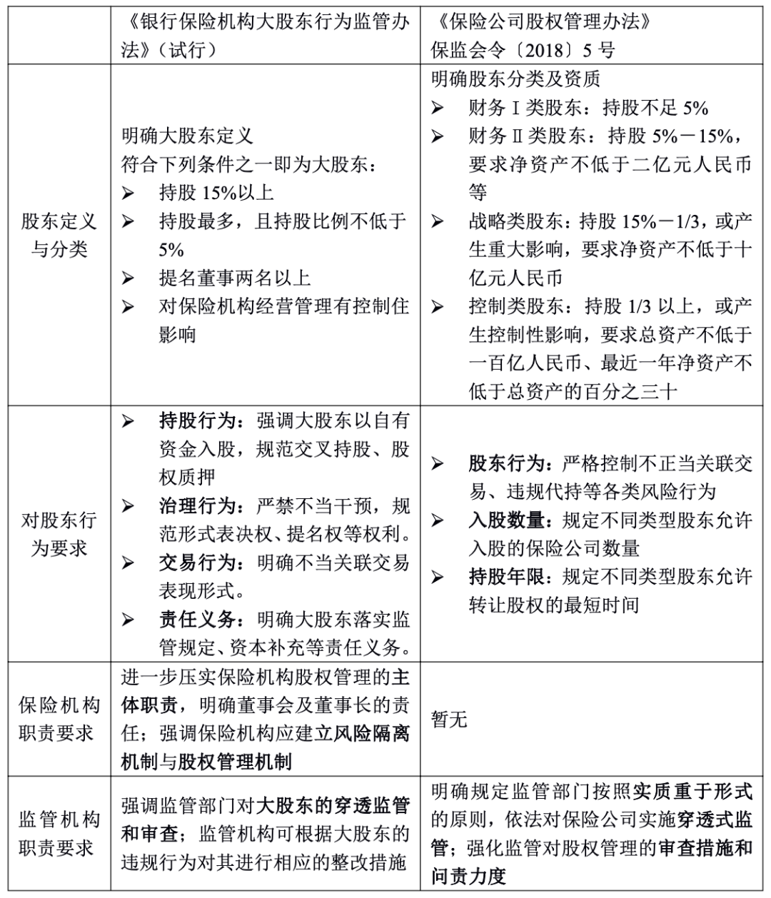目前,對保險公司股權管理及股東行為起約束作用的監管規定主要是《大股東監管辦法》和《股權管理辦法》。對比來看,《股權管理辦法》對保險公司股東準入、股權管理、關聯交易等作出相應的監管規定;《大股東監管辦法》則重點從大股東角度出發,明確其責任義務,規范其股東行為,加強事中事后監管,是對現有股權監管制度的細化補充和完善統一。兩個制度的對比分析具體如下: