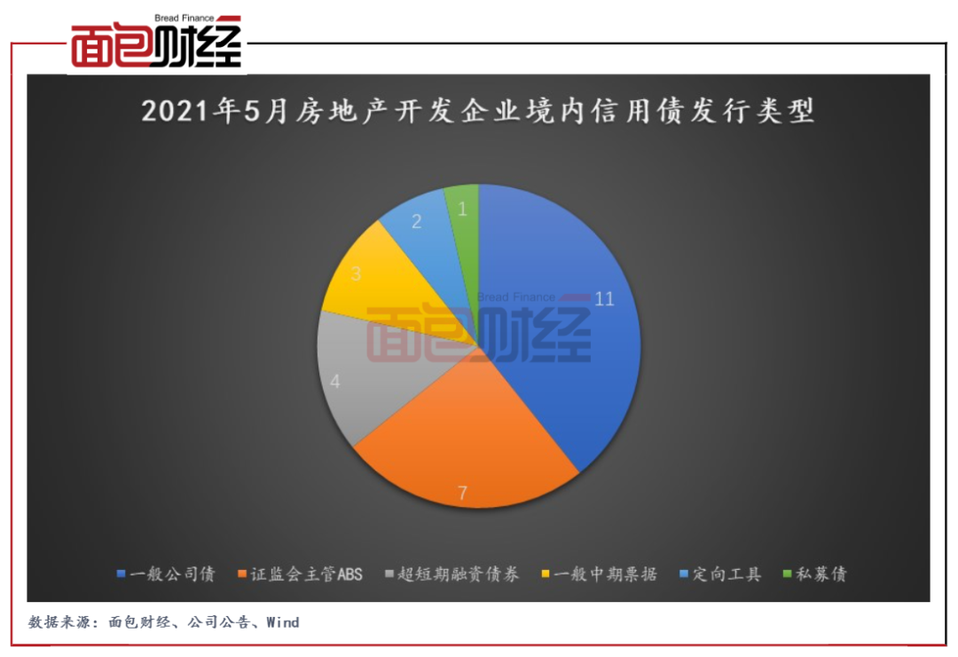 從占比上來看,2021年5月,國內房地產開發企業共計發行信用債28只,其中一般公司債為房企信用債融資的主要渠道。5月,房企一般公司債共發行11只,占比39.29%;其次為證監會主管ABS(Asset Backed Securitization)和超短期融資債券,當月發行數量分別為7只和4只,占比分別為25%和14.29%。