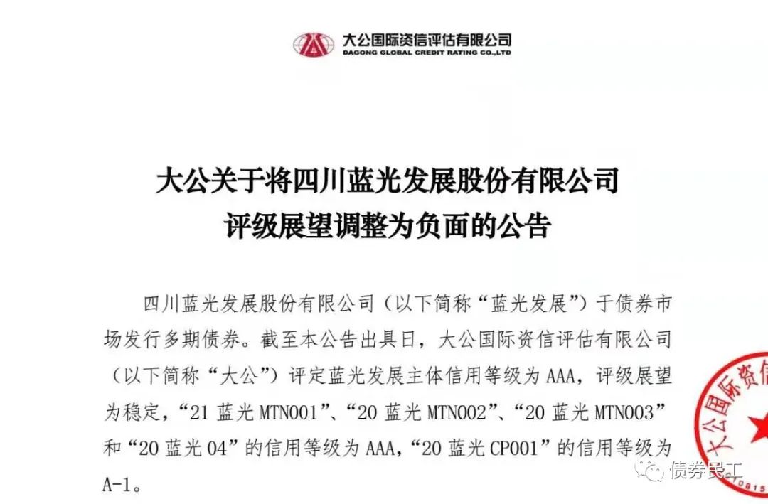 1、2021年6月1日,四川藍(lán)光發(fā)展股份有限公司(以下簡(jiǎn)稱“藍(lán)光發(fā)展”)發(fā)布公告,大公國(guó)際決定維持藍(lán)光發(fā)展主體信用等級(jí)AAA,評(píng)級(jí)展望調(diào)整為負(fù)面。評(píng)級(jí)展望調(diào)整為負(fù)面的主要原因是部分項(xiàng)目去化壓力較大、新增土地儲(chǔ)備規(guī)模減少、盈利能力有所下滑、短期償債壓力較大等。而在大公國(guó)際調(diào)整藍(lán)光發(fā)展的評(píng)級(jí)展望之前,標(biāo)普于2021年5月31日將藍(lán)光發(fā)展的長(zhǎng)期發(fā)行人信用評(píng)級(jí)從“B+”下調(diào)至“B-”,并置于負(fù)面信用觀察名單。