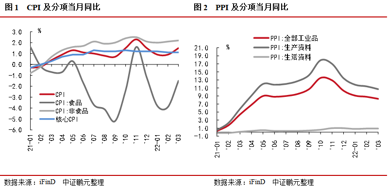 3月,全國居民消費價格CPI同比上漲1.5%,漲幅比上月擴大0.6個百分點,去年價格變動的翹尾因素影響約為0.4個百分點,新漲價影響約為1.1個百分點,扣除食品和能源價格的核心CPI同比上漲1.1%,漲幅與2月相同。CPI環(huán)比由上月上漲0.6%轉為持平。從CPI分項環(huán)比來看,食品價格由上月上漲1.4%轉為下降1.2%,豬肉價格下降9.3%,受國際小麥、玉米和大豆等價格上漲及國內疫情影響,面粉、食用植物油、鮮菜和雞蛋價格分別上漲1.7%、0.6%、0.4%和0.3%;非食品價格上漲0.3%,其中工業(yè)消費品價格上漲1.1%,主要是能源價格上漲帶動,汽油、柴油和液化石油氣價格分別上漲7.2%、7.8%和6.9%。從CPI分項同比來看,食品價格下降1.5%,豬肉價格下降41.4%,降幅比上月收窄1.1個百分點;非食品價格上漲2.2%,漲幅比上月擴大0.1個百分點,影響CPI上漲約1.77個百分點。