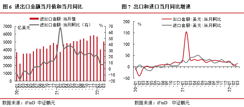 4月13日,海關總署公布3月和一季度外貿數(shù)據(jù):按美元計,出口同比增速為14.7%,較1-2月16.3%的同比增速有所回落;進口同比出現(xiàn)負增長,增速由1-2月的15.5%降至3月的-0.1%;貿易順差為473.8億美元,明顯低于2021年下半年平均水平。總的來看,3月中國出口韌性繼續(xù)顯現(xiàn),但受疫情影響,防控政策收緊、國際大宗商品價格高漲等因素開始成為進口回落的壓力來源,進口表現(xiàn)明顯不及預期。