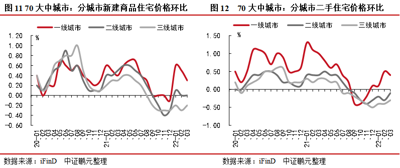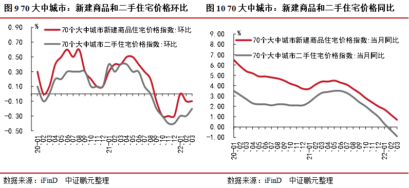 3月份,70個大中城市新建商品住宅和二手住宅銷售價格環(huán)比分別上漲-0.1%和-0.2%,前值為-0.1%和-0.3%,環(huán)比繼續(xù)下降。同比分別上漲0.7%、-0.9%,前值為1.2%、-0.3%,同比漲幅繼續(xù)回落。