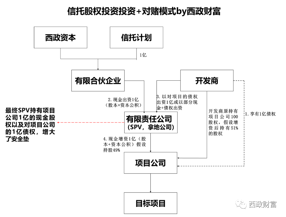 1. 信托計(jì)劃投資有限合伙L(fēng)P份額(即1億)對有限責(zé)任公司SPV進(jìn)行增資,部分進(jìn)入實(shí)收資本,大部分進(jìn)入資本公積。開發(fā)商則以對項(xiàng)目公司的債權(quán)(或債權(quán)+部分現(xiàn)金)對SPV進(jìn)行出資。