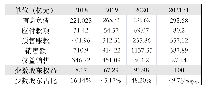 除了明面上的債務(wù),新力地產(chǎn)還有兩大風(fēng)險(xiǎn):一是較低銷售權(quán)益比所對(duì)應(yīng)的較高少數(shù)股東權(quán)益;二是針對(duì)上下游企業(yè)的應(yīng)付款項(xiàng)。▼