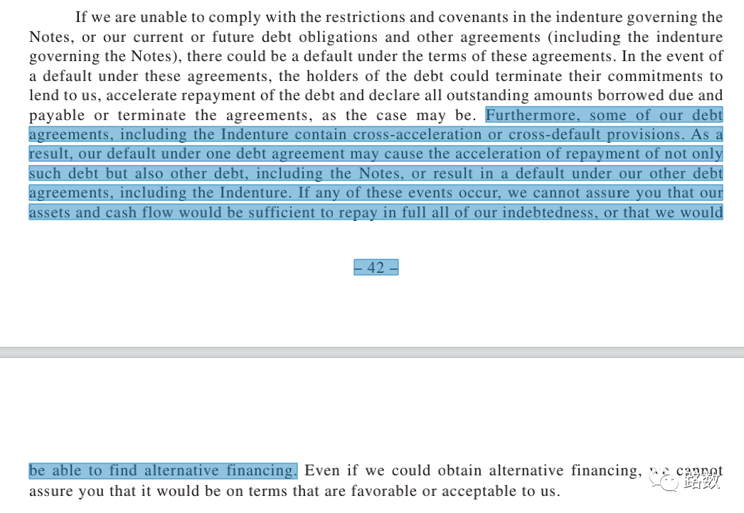 根據(jù)債券募集說明書,當(dāng)中包含了加速清償和交叉違約條款。債務(wù)一旦發(fā)生違約,會(huì)觸發(fā)部分公募、銀行、信托借款的交叉違約,需要公司提前進(jìn)行還款,屆時(shí)資金鏈壓力巨大。▼