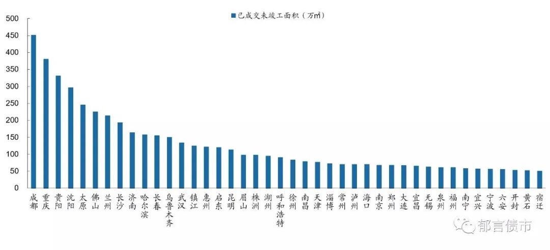 已售未交付面積達到200萬方的城市包括:成都、重慶、貴陽、沈陽、太原、佛山、蘭州等7個城市。