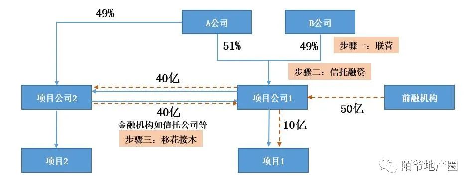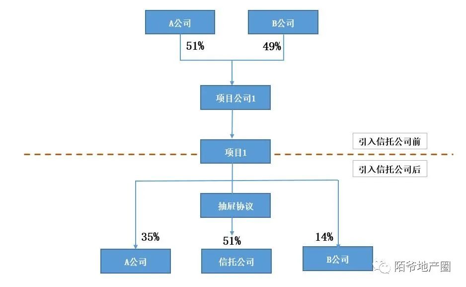 步驟二、通過信托機構進行前融,信托公司引入,增持a項目股權至51%
