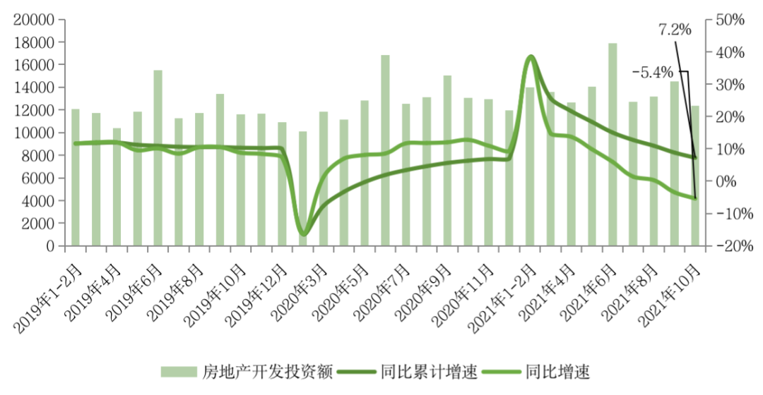 2021年1-10月,全國房地產(chǎn)開發(fā)投資124934億元,同比增長7.2%;比2019年1—10月增長14.0%。兩年增速較1-9月分別收窄1.6pct和0.9pct。10月單月完成開發(fā)投資額12366億元,同比下降5.4%,降幅較9月進一步擴大1.9pct,環(huán)比則下降14.8%。