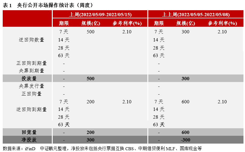上周(2022/05/09-2022/05/15)央行7天逆回購投放500億元,7天逆回購到期200億元,合計凈投放300億元。上周多空交織,債市主要交易社融數據,債券收益率震蕩。當前疫情拐點已現,上海疫情逐步好轉且復工復產在持續推進、北京疫情仍處于波動中但新增感染人數并未出現大幅增加,疫情的影響雖然在持續但逐漸消化,重點關注穩增長政策的加碼和落地效果。貨幣政策繼續保持穩健,整體流動性合理充裕,總量的降息可能性較小(降低MLF和7天逆回購利率),主要掣肘于通脹和國外加息,5月LPR單邊調低的可能性極大。