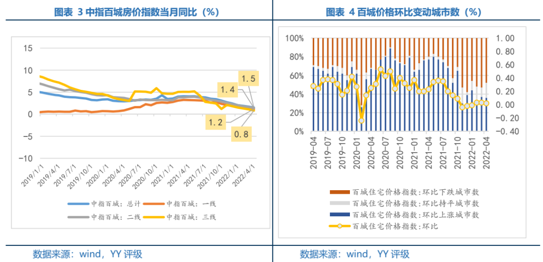 價(jià)格方面百城價(jià)格同比和環(huán)比均回落,其中一、三線同比下降幅度較3月更大。一線城市需求主因疫情限制,而弱三線普遍仍是“以價(jià)換量”思路,但結(jié)合銷售規(guī)模來看,此效果已大打折扣。環(huán)比上漲城市減少1個(gè),新增6個(gè)持平,更多地城市房?jī)r(jià)維持低迷常態(tài),三線城市價(jià)格反彈的趨勢(shì)目前來看并不成立。