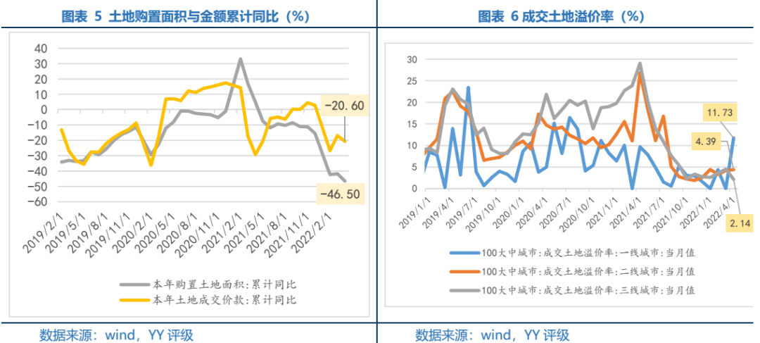 疫情影響難以消除,疊加行業(yè)債務(wù)問題尚未解決,土地購(gòu)置情緒仍在低位。1-4月房地產(chǎn)開發(fā)企業(yè)土地購(gòu)置面積1,766萬方,土地成交款955億,同比分別下降46.5%、20.6%,較1-3月跌幅繼續(xù)擴(kuò)大4.7pct和3.7pct。一方面銷售持續(xù)冰封導(dǎo)致全行業(yè)投資意愿在減弱,三四線高庫存下房企規(guī)避情緒在升溫,同時(shí)房企的資金鏈緊張并未緩解使得投資能力也被削弱,另一方面疫情也客觀的限制了開復(fù)工進(jìn)度。以上因素相互制約,預(yù)計(jì)后續(xù)拿地走弱局勢(shì)難看到全面翻盤。