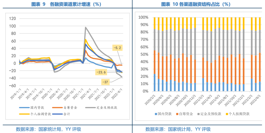 資金來源端4月還在邊際惡化,結(jié)合4月金融數(shù)據(jù),新增居民貸款中住房貸款減少605億,同比少增4,022億,購(gòu)房者對(duì)后續(xù)樓市信心持續(xù)下降。根據(jù)統(tǒng)計(jì)局?jǐn)?shù)據(jù),22年1-4月房地產(chǎn)開發(fā)企業(yè)到位資金同比下降23.6%,較1-3月份繼續(xù)下跌4.0pct。具體渠道看,貸款、自籌資金、預(yù)收款和個(gè)人按揭分別同比-24.4%、-5.2%、-37.0%和-25.1%,分別較1-3月-0.9pct、-0.4pct、-6.0pct和-6.3pct。其中經(jīng)營(yíng)性回款(即預(yù)收款和個(gè)人按揭)的到位資金中占比持續(xù)下滑。預(yù)計(jì)后續(xù)地產(chǎn)資金來源仍處于偏緊狀態(tài),需要緊密跟蹤的是在政策持續(xù)強(qiáng)力的供給端放松推動(dòng)下,到位資金可能下跌幅度逐漸收窄,具體要看來自需求端刺激下的經(jīng)營(yíng)回款貢獻(xiàn)更大還是融資政策放松下融資現(xiàn)金的回籠更顯著,二者也互為因果。
