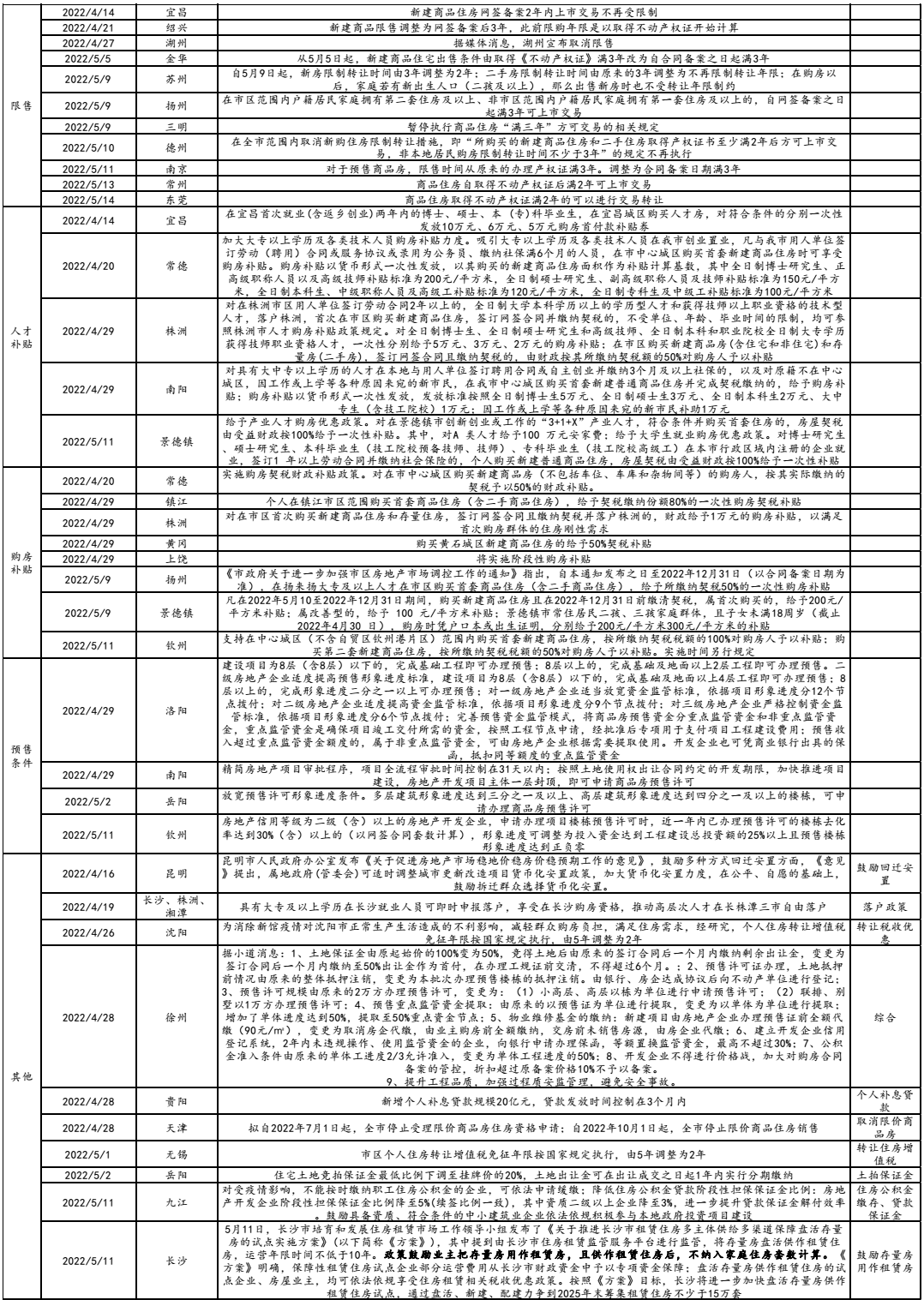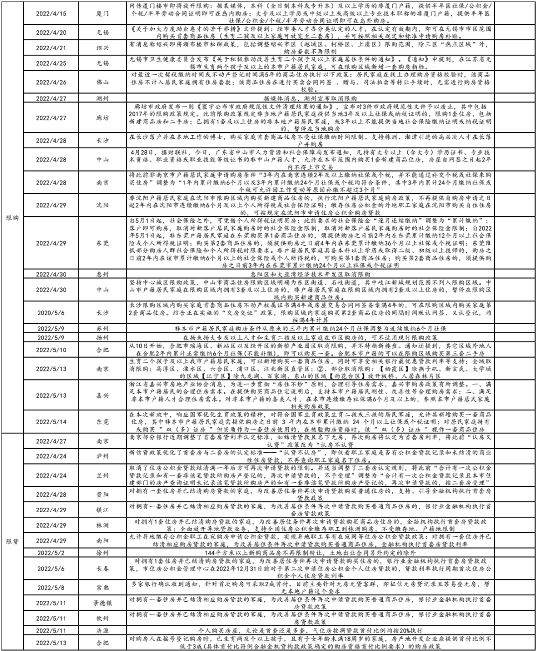 截至5月16日,22年以來全國(guó)累計(jì)出臺(tái)紓困政策近300次,當(dāng)前樓市松綁較之前進(jìn)入第二階段,更多省會(huì)強(qiáng)二線城市加入,如成都、杭州、蘇州等,更有長(zhǎng)沙提出的創(chuàng)新思路即“鼓勵(lì)存量房做租賃房”,但這些政策實(shí)操層面有諸多限制,且更大目的在下行時(shí)托市,針對(duì)于遠(yuǎn)郊和二手房市場(chǎng),邊際改善程度有限。
