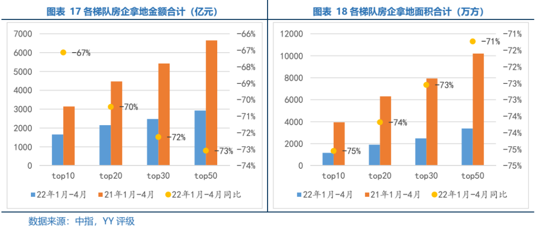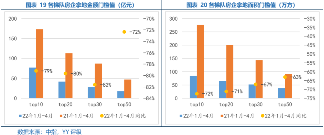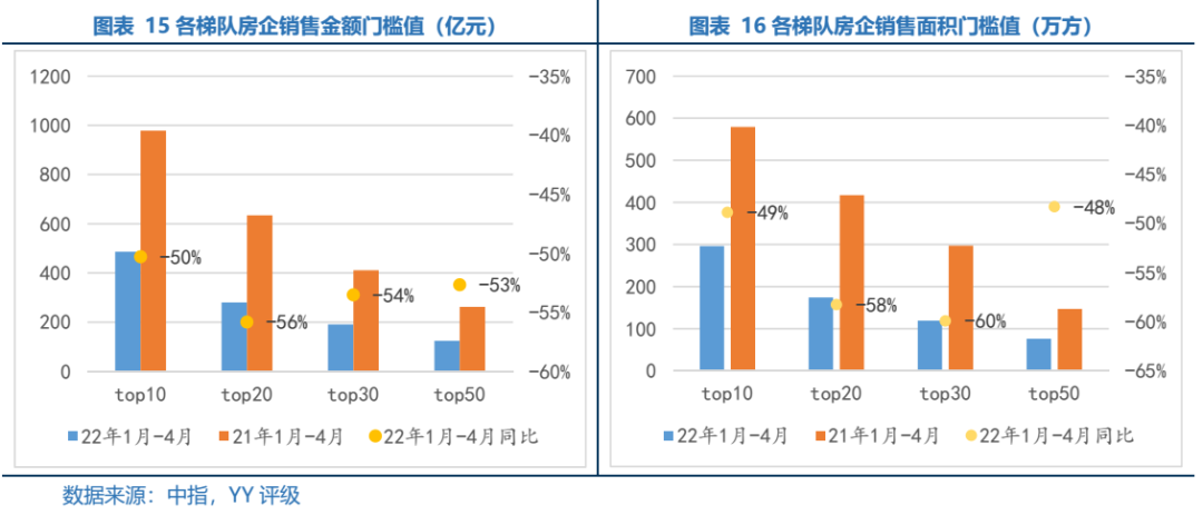 銷售門檻值方面,2022年1-4月全國(guó)TOP10-50房企銷售金額同比下滑最高至82%,top10拿地金額和面積的跌幅表現(xiàn)更弱。