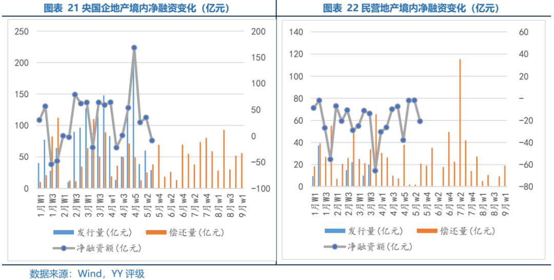 央國(guó)企境內(nèi)凈融資近三周趨勢(shì)向好,由負(fù)轉(zhuǎn)正,民企凈流出幅度收窄,仍舊未有新發(fā)行增量,但5月中旬以后將迎來大批償還,后續(xù)6、7月份仍將是到期大月,主體在持續(xù)的流動(dòng)性沖擊下將變得更加脆弱。