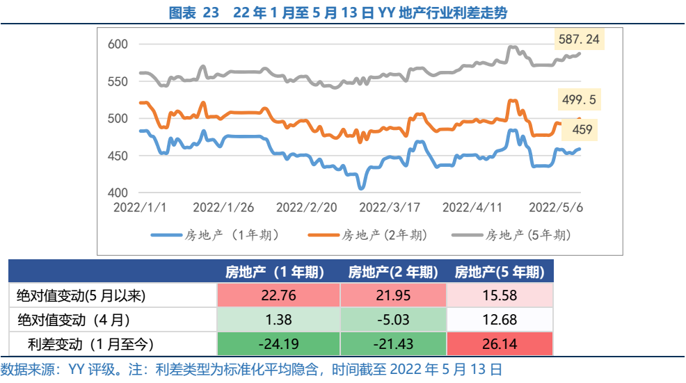 YY地產(chǎn)利差在3月初走過階段性低點(diǎn)后整體繼續(xù)呈現(xiàn)上行態(tài)勢(shì),4月1、2、5年期行業(yè)利差波動(dòng),分別變動(dòng)1.4、-5.0和12.7, 5月恢復(fù)上行趨勢(shì),1、2、5年期行業(yè)利差分別上行22.8、22.0和15.6,資金撤離民營(yíng)房企,行業(yè)估值風(fēng)險(xiǎn)未退。