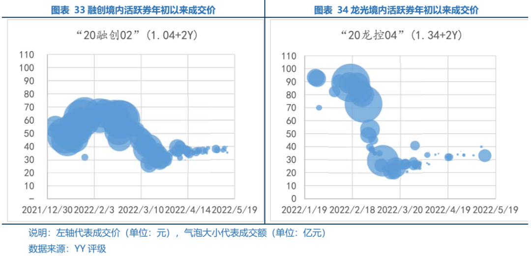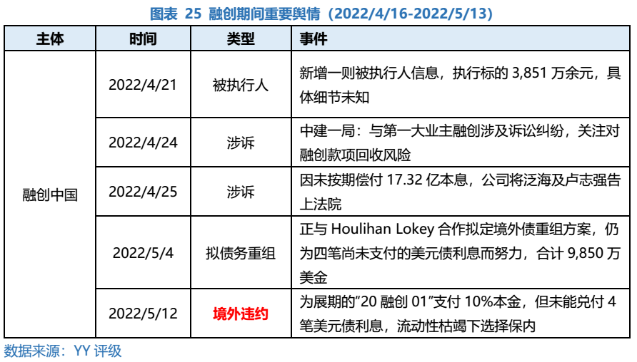 具體來看,熱點(diǎn)主體方面,融創(chuàng)一方面新增被執(zhí)行人信息、訴訟糾紛等負(fù)面輿情,另一方面由于極度枯竭的流動(dòng)性壓力,選擇“棄外保內(nèi)”:遵循展期方案部分兌付境內(nèi)展期債,而境外美元票據(jù)4筆利息違約,以避免觸發(fā)在岸銀行貸款更大規(guī)模的交叉違約,境內(nèi)外表現(xiàn)出明顯的割裂感。這也是此輪地產(chǎn)暴雷潮中一個(gè)普遍的現(xiàn)象。公司將20融創(chuàng)01展期,寄希望于以時(shí)間換空間,但3-4月份公司重點(diǎn)布局的城市受疫情影響嚴(yán)重,銷售額大幅下滑65%左右,資金回籠難度也進(jìn)一步加大。