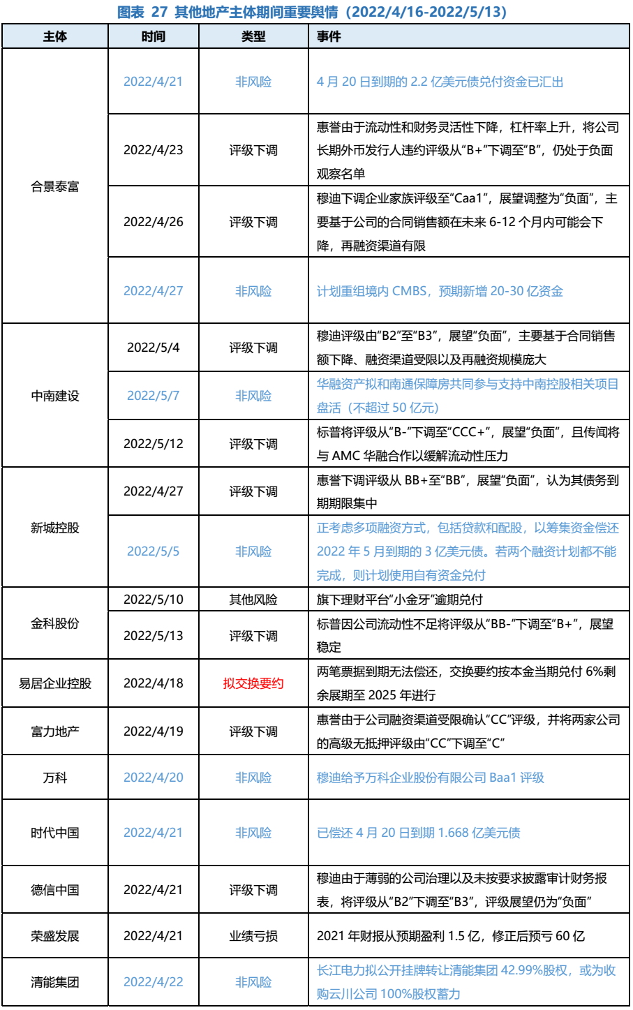 其他地產(chǎn)主體方面,(1)該期間,評(píng)級(jí)下調(diào)的主體有合景泰富、中南建設(shè)、新城控股、金科股份、富力地產(chǎn)、德信中國(guó)、佳源國(guó)際控股、紅星美凱龍、綠地控股集團(tuán)等,下調(diào)原因主要為銷售端降幅明顯、流動(dòng)性緊張、再融資渠道有限和債務(wù)到期期限集中等。(2)發(fā)生業(yè)績(jī)虧損事項(xiàng)的有:榮盛發(fā)展(2021財(cái)報(bào)修正后預(yù)虧60億)、朗詩集團(tuán)(2021年度合并凈虧損-5.58億)和新希望地產(chǎn)(股東新希望集團(tuán)2021年歸母凈利潤(rùn)-13.6億元)。(3)中梁控股和易居企業(yè)控股均因流動(dòng)性吃緊擬對(duì)境外債進(jìn)行交換要約,其中易居企業(yè)控股主營(yíng)地產(chǎn)數(shù)據(jù)、經(jīng)紀(jì)、代理業(yè)務(wù),表明地產(chǎn)行業(yè)周期向下的影響已經(jīng)蔓延至服務(wù)商等地產(chǎn)三方服務(wù)機(jī)構(gòu)。(4)還值得關(guān)注的典型事件是金科股份理財(cái)產(chǎn)品逾期,暴露流動(dòng)性壓力冰山一角。(5)此外,新城、寶龍、遠(yuǎn)洋和合景泰富仍在努力各項(xiàng)融資方式進(jìn)行再融資緩解償債壓力。