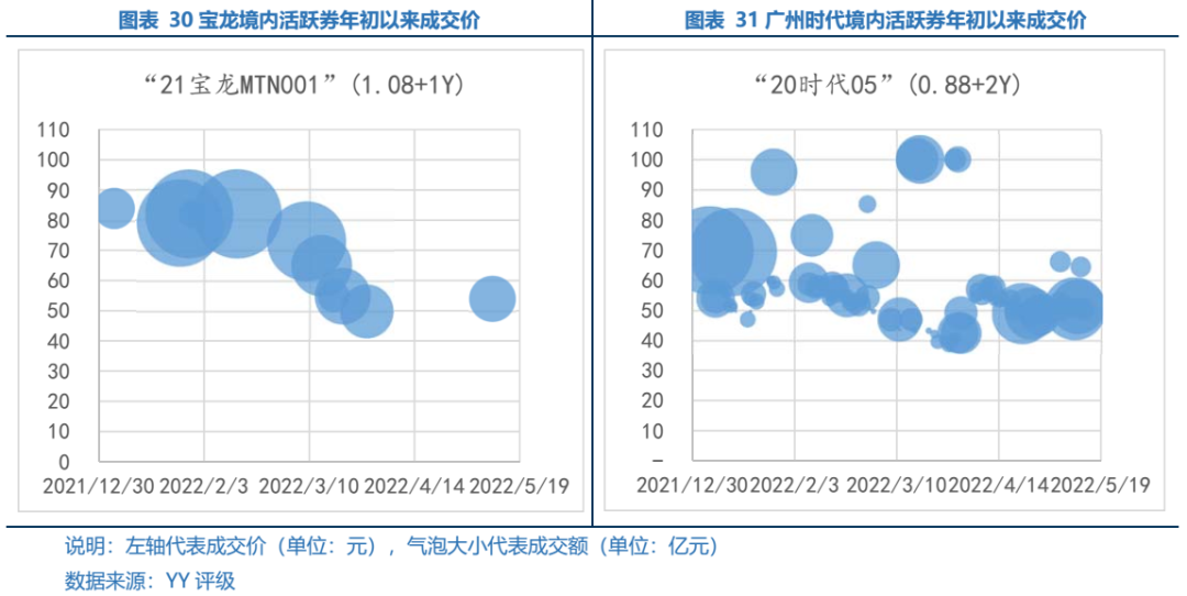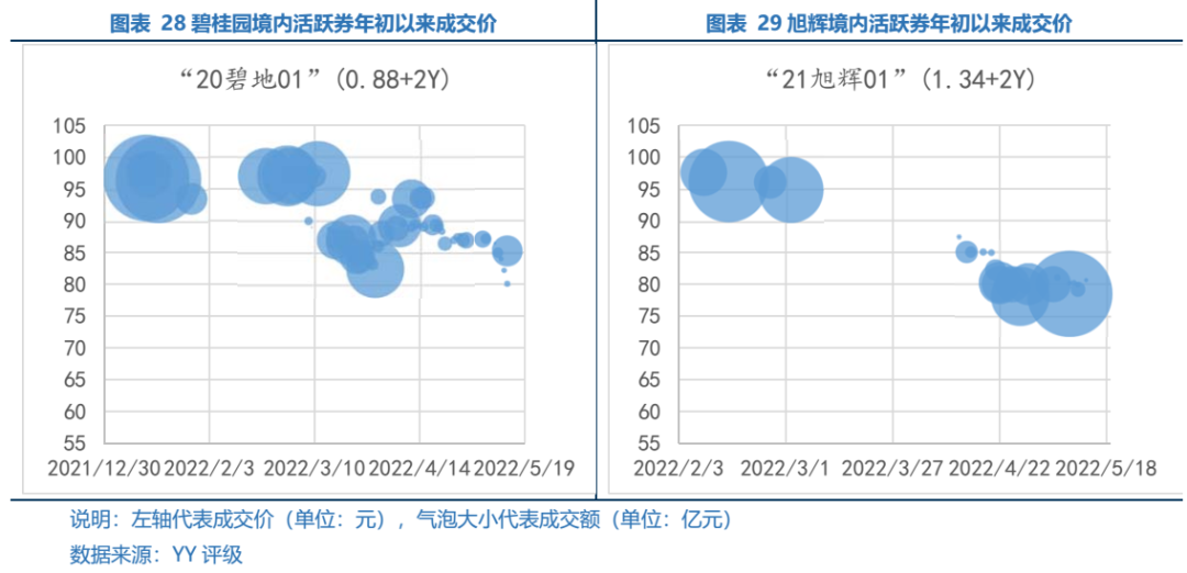尚未展期/違約的民企方面,受行業(yè)內(nèi)主體負(fù)面信用事件影響,尚未展期/違約主體的市場(chǎng)成交價(jià)呈下探趨勢(shì),但不同資質(zhì)主體成交價(jià)區(qū)間分層。碧桂園“福州事件”引發(fā)市場(chǎng)關(guān)注,“20碧地01”價(jià)格下跌至80元左右;因旭輝22年到期的境內(nèi)債券均已到期償付,給予市場(chǎng)一定信心,“21旭輝01”自4月下旬以來成交價(jià)在80元左右徘徊;寶龍22年為債券大年,且兩度推遲披露年報(bào),“21寶龍MTN001”由80元檔一路下跌,目前成交在54元;時(shí)代向廣州市政府懇請(qǐng)退地,表明舊改項(xiàng)目資金沉淀壓力較大,“20時(shí)代05”跌至40元檔位。