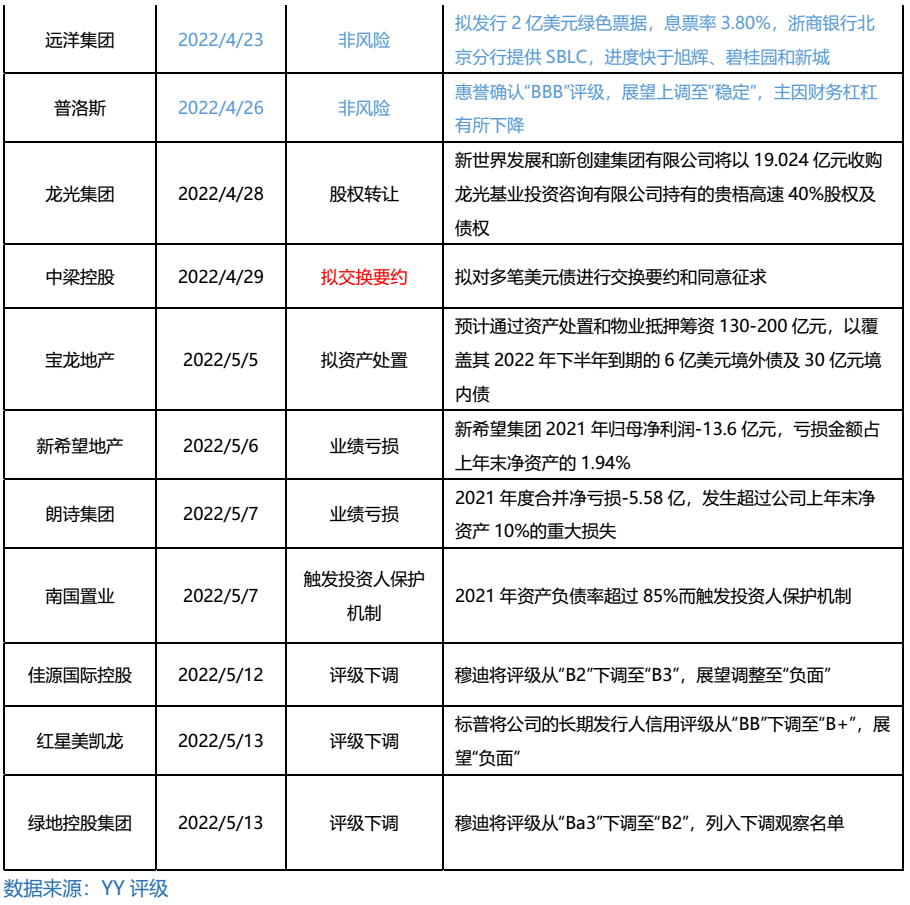 2022年4月16日至5月13日,YY評(píng)級(jí)綜合評(píng)估行業(yè)基本面、個(gè)體信用資質(zhì)及負(fù)面輿情等因素,下調(diào)2家地產(chǎn)主體評(píng)級(jí),易居(中國(guó))企業(yè)控股有限公司評(píng)級(jí)下調(diào)主要系依賴的房屋買賣和公關(guān)服務(wù)模式受疫情影響較大,生存環(huán)境惡化;金科地產(chǎn)集團(tuán)股份有限公司評(píng)級(jí)下調(diào)主要系旗下理財(cái)產(chǎn)品“小金牙”存在逾期兌付情況,流動(dòng)性進(jìn)一步承壓。
