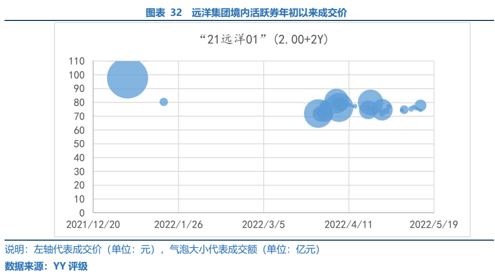 民企爆雷引發(fā)的市場(chǎng)負(fù)面情緒波及混改企業(yè),遠(yuǎn)洋集團(tuán)的表外債務(wù)規(guī)模較大構(gòu)成隱憂,而近期公募基金等機(jī)構(gòu)出庫對(duì)公司存量債券估值造成了較大上行壓力,年初以來“21遠(yuǎn)洋01”價(jià)格已由98元跌至70元檔位。