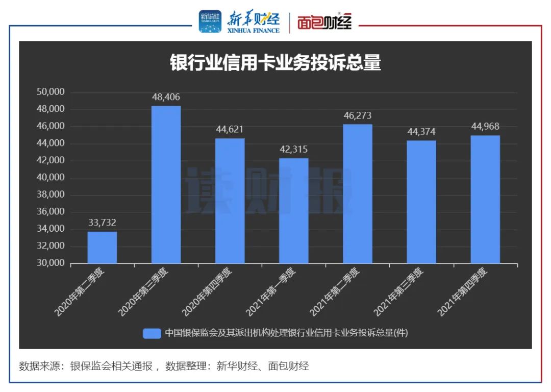 中國銀保監會消費者權益保護局公布的數據顯示,2021年銀保監累計處理信用卡業務投訴超17萬件。其中,2021年第四季度處理信用卡業務消費投訴44968件,較第三季度環比上升1.3%。