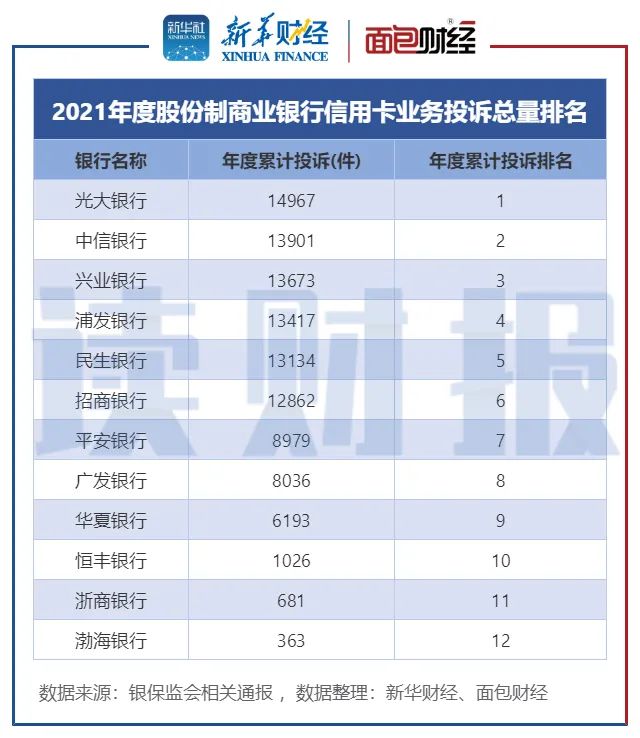 2021年全年,光大銀行、中信銀行、興業銀行分別位居銀行信用卡業務累計投訴量前三甲。