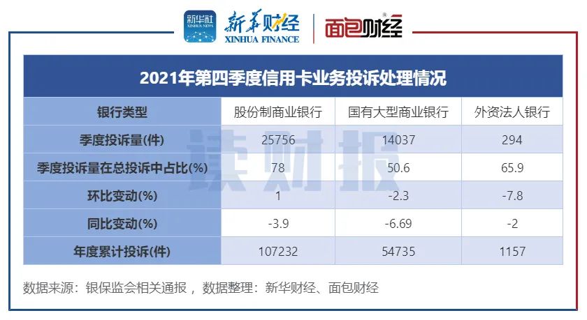 值得注意的是,信用卡業務投訴是銀行各類業務投訴中占比最高的類型。2021年第四季度,國有銀行、股份制銀行和外資法人銀行的信用卡業務投訴量在各自投訴總量中的占比分別高達50.6%、78%和65.9%。