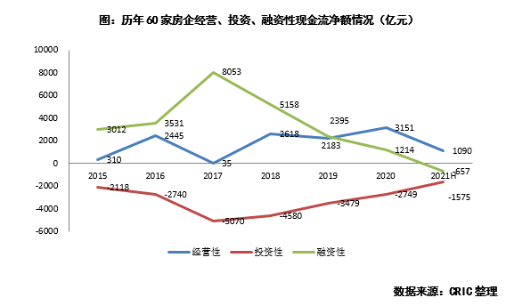 自2020年8月三條紅線提出至今,已過去了快一年的時間,期間現金流管理的重要性日益凸顯。在2021年中報披露季后,我們篩選了60家典型樣本房企,分析他們歷年的經營性、投資性及融資性現金流凈額變化,哪些房企在現金流方面表現突出?哪些房企依舊依靠融資驅動?