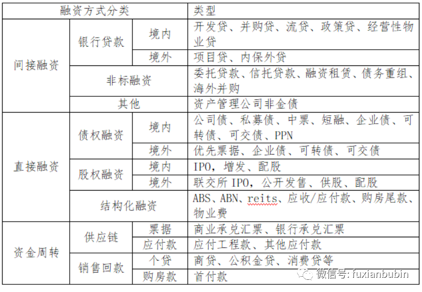 經(jīng)過(guò)多年發(fā)展,中國(guó)房地產(chǎn)已經(jīng)形成了近50個(gè)細(xì)項(xiàng)的融資體系。包括了銀行貸款、非標(biāo)融資、股權(quán)融資(IPO、增發(fā)等)、債權(quán)融資(公司債、企業(yè)債、私募債、中票等)、供應(yīng)鏈金融、銷(xiāo)售回款等。從各渠道融資申請(qǐng)難易程度來(lái)看,目前,短期融資、中期票據(jù)、定向工具、ABS發(fā)行難度較低;房地產(chǎn)開(kāi)發(fā)貸、海外債、公司債、非標(biāo)融資發(fā)行難度較大;IPO、定向增發(fā)已經(jīng)基本停止。具體融資分類(lèi)如下圖:
