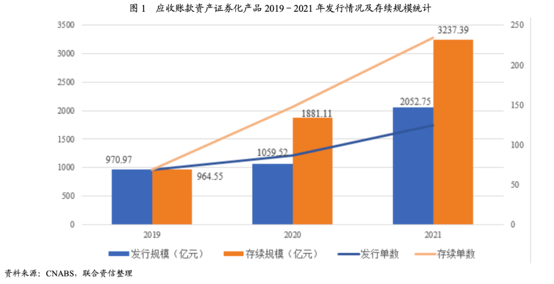 從發行情況來看,2019-2021年,應收賬款資產證券化產品在交易所市場和銀行間市場共發行280單,發行規模4083.24億元,近三年來,應收賬款資產證券化產品發行規模逐年遞增;截至2021年末,處于存續期的應收賬款資產證券化產品合計234單,存續規模合計3237.39億元。近三年來發行情況如下圖所示。