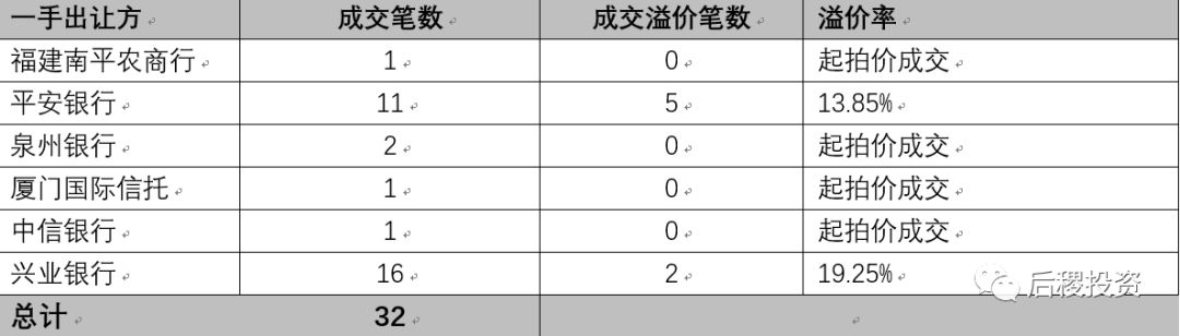 2017年全國各省資產包價格的瘋漲,福建省一手包從以往綜合價格折扣率0.25-0.33之間,上漲到0.44-0.53左右,甚至很多偏遠縣市的資產包也出現了一線城市的價格。但2018年在價值回歸的過程中,福建省一手成交價格逐漸趨于理性略有回落。公開成交數據顯示,32筆交易中僅有7筆出現小幅度的溢價,多數一手項目皆為起拍價成交。