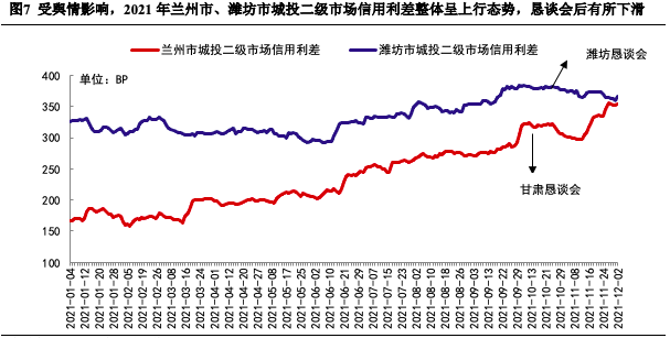 此外,2021年多個地級市主要平臺出現信用輿情事件。例如在蘭州地區地級市平臺風險事件連續發酵,2021年8月蘭州交通發展建設集團有限公司在中登網上被登記為融資租賃展期(后解釋為融資租賃公司登記有誤),且區域內多家平臺均有債券取消發行情況,受此影響,蘭州市城投二級市場信用利差持續走高。后為化解債務信用危機,甘肅省地方金融監管局于2021年10月召開投資者懇談會,提出“針對國有企業存續債券,省市兩級堅決采取過硬措施,全力推動風險化解,堅決守住不發生系統性風險的底線?!钡@一系列舉措暫未見明顯效果,蘭州市城投二級市場信用利差短暫下跌后進一步上行。