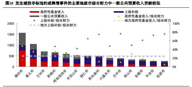 從財力構成來看,發生非標違約或輿情事件的主要地級市一般公共預算收入貢獻較低,自身造血能力相對較弱,上級補助收入占比普遍較高。在地方財力相對較高的濰坊市、遵義市、蘭州市、黔南州、呼和浩特市等地,政府性基金收入占比超過全國平均水平,地區財力對土地財政依賴較大。2021年6月,財政部等四部委發布《關于將國有土地使用權出讓收入、礦產資源專項收入、海域使用金、無居民海島使用金四項政府非稅收入劃轉稅務部門征收有關問題的通知》(財綜[2021]19號),將由自然資源部門負責征收的國有土地使用權出讓收入、礦產資源專項收入、海域使用金、無居民海島使用金四項政府非稅收入,全部劃轉給稅務部門負責征收。這一舉措暫未改變分配至地方政府的土地出讓收入,但增加稅務部門征收這一環節使得地方政府對土地出讓金的支配權限下降,也變相影響地方政府向地方城投輸血的通道。同時,2021年在房地產監管政策收緊的情況下,房地產公司拿地熱情下降,多地土地出現流拍情況,根據中指院數據,濰坊市、遵義市、蘭州市、黔南州、呼和浩特市2021年1-7月住宅土地出讓金均出現同比下滑。