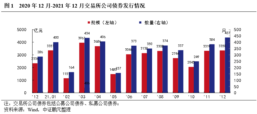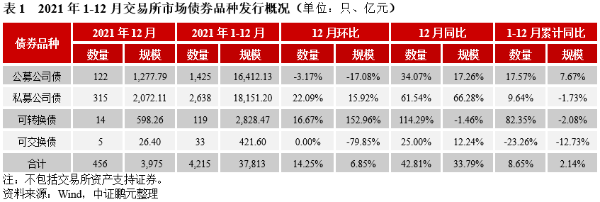 2021年12月份,我國交易所市場共發(fā)行信用債券456只,發(fā)行規(guī)模3,975億元;發(fā)行數(shù)量和規(guī)模環(huán)比分別上升14%和7%,私募公司債本月發(fā)行較多。