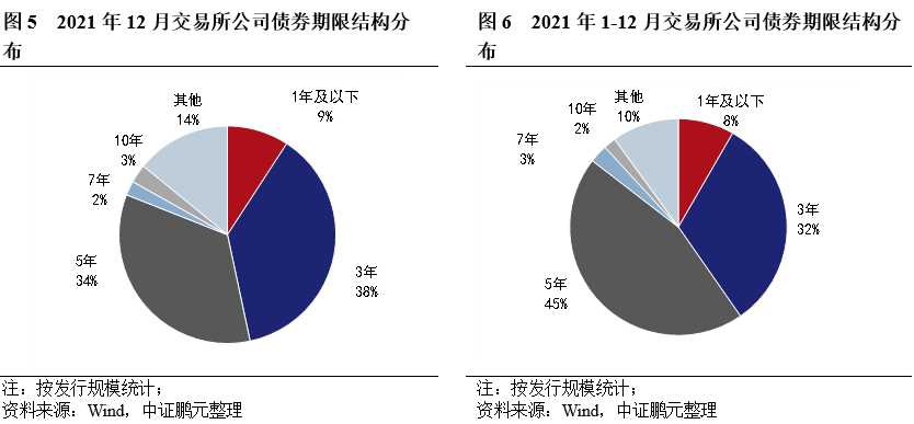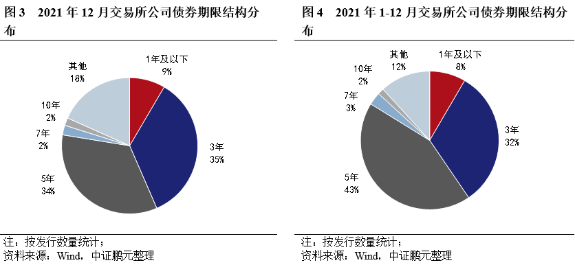 綜合2021年1-12月份來看,3年期的交易所公司債券發(fā)行1,303只,累計發(fā)行規(guī)模11,065.76億元,占比分別為32%和32%;5年期的交易所公司債券發(fā)行1,760只,累計發(fā)行規(guī)模15,602.80億元,占比分別為43%和45%。分債券品種而言,1-12月份3年期和5年期公募公司債發(fā)行數(shù)量分別占比34.5%和43.9%,發(fā)行規(guī)模占比分別36%和42%;3年期私募債發(fā)行數(shù)量和發(fā)行規(guī)模分別占比31%和43%,5年期私募債發(fā)行數(shù)量和發(fā)行規(guī)模分別占比28%和48%。
