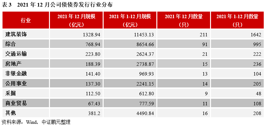 2021年12月份,交易所公司債券的發(fā)行人主要分布于建筑裝飾和綜合行業(yè)。具體來看,建筑裝飾行業(yè)發(fā)行211只,占比53%,發(fā)行規(guī)模1,329億元,占比40%,位居首位;其次是綜合行業(yè),發(fā)行91只,占比為23%,發(fā)行規(guī)模769億元,占比23%,位于第二;交通運輸行業(yè)發(fā)行21只,占比為5%,發(fā)行規(guī)模224億元,占比7%,位于第三。1-12月整體來看,建筑裝飾、綜合和房地產(chǎn)行業(yè)位居前三,分別發(fā)行11,453.13億元、8,654.66億元和2,738.87億元。