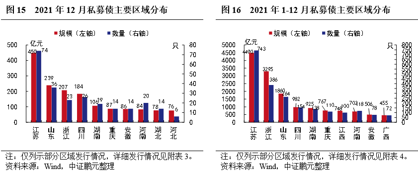 私募債券方面,2021年12月份,私募債券的發(fā)行人分布于26個地區(qū),以江蘇、山東、浙江等地為主。從發(fā)行規(guī)模來看,江蘇發(fā)行449.76億元位居榜首,山東發(fā)行239.28億元位居第二,浙江發(fā)行207.08億元位居第三位,發(fā)行數(shù)量分別為74只、36只、23只。從凈融資來看,12月份江蘇、浙江、山東分別以凈融資196.71億元、151.08億元、150.44億元位于前三位,廣東、貴州、海南分別凈償還39.67億元、16.98億元、13.50億元。綜合1-12月,江蘇以發(fā)行743只、累計發(fā)行規(guī)模4,489.72億元位居首位,遠(yuǎn)高于其地地區(qū);浙江以發(fā)行386只、累計發(fā)行規(guī)模3,294.52億元位居第二;山東以發(fā)行264只、累計發(fā)行規(guī)模1,860.44億元位居第三;浙江、江蘇、山東分別以累計凈融資2,561.34億元、2,038.67億元、950.47億元位于前三位,北京、天津、上海分別凈償還495.34億元、452.00億元、314.94億元。
